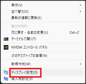 - デスクトップの何もない場所で右クリックし、「ディスプレイ設定」を選択